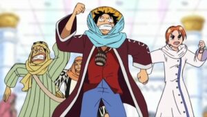 The Straw Hats, with Kureha’s assistant Tony Tony Chopper, finally arrive at Arabasta, which is on the verge of civil war. Vivi must reach the rebels and tell them the real cause behind the conflict, but Crocodile, leader of Baroque Works and one of the Seven Warlords of the Sea, will not just stand by and watch. In the end, Baroque Works, marine forces, pirates, the royal guards, and the rebel army clash in a battle that will determine the fate of the country itself.